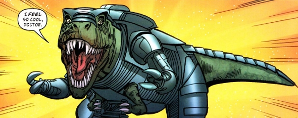 On le savait, Kevin n'était pas destiné à rester éternellement à bord du TARDIS, cette histoire se déroulant avant la saison 6, mais on aurait aimé le voir plus longtemps, même s'il a finalement trouvé sa place. L'idée d'un tyrannosaure robotique devait être plaisante dans la tête de Tony Lee, mais il a du vite se rendre compte que ça n'allait pas pouvoir durer.
