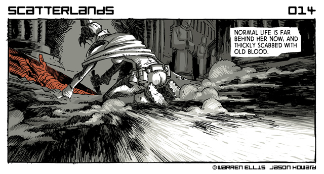 Il revient cette fois-ci en compagnie de Jason Howard (Super Dinosaur) avec un nouveau webcomic : Scatterlands. Le rythme est spécial puisque paraît sur le site de Warren Ellis une case par jour, du lundi au vendredi.