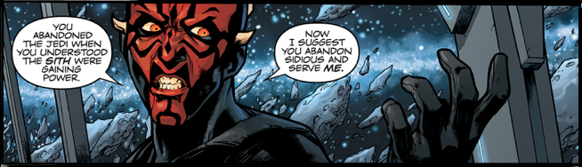 Mais en attendant la date fatidique, l'éditeur au Cheval Noir a décidé de profiter de ces derniers mois pour boucler ses nombreuses séries comme Star Wars ou encore Star Wars Legacy Season 2. L'éditeur a d'ailleurs prévu de caler sur un dernier créneau une mini-série en quatre parties sur un personnage au crâne rouge, noir et habillé de pics, Darth Maul: Son of Dathomir. Confiée à Jeremy Barlow, l'éditeur de nombres de titres Star Wars, et Juan Frigeri, l'aventure focalisée sur le Sith de Star Wars: Épisode I n'est pourtant pas originale puisque cette dernière devait se caler dans la sixième saison de la série animée The Clone Wars.