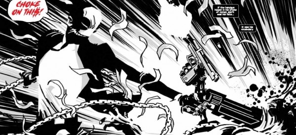 Je n'y pense pas vraiment, pour être honnête. Je sais que je suis influencé par Miller, mais dans ma tête, pas plus que par Steranko ou Toth ou une douzaine d'autres types. Je pense que ça relève plus des histoires de Miller et de son approche : les auteurs-dessinateurs ont plus ou moins tous disparus des comics mainstream. Miller était le dernier à porter ce manteau. Et je suis l'un des rares qui le porte aujourd'hui. Ça me rappelle une histoire. Je regardais Sin City 2 avec un spécialiste des effets spéciaux et il m'a posé des questions sur cette technique qui consiste à intervertir les couleurs des lignes pour indiquer des ombres. Des briques blanches avec un cadre noir qui deviennent des briques noires avec un contour blanc là où tombent les ombres, par exemple. Et il m'a demandé si c'était une invention de Miller. J'ai dû rire, parce que c'est une technique si fondamentale et commune pour l'univers des comics ! Tout ce qu'il connaissait, lui, c'était Miller, donc pour lui, Miller avait dû l'inventer. L'homme à une importance si énorme sur notre monde qu'on ne peut lui échapper, voilà tout.