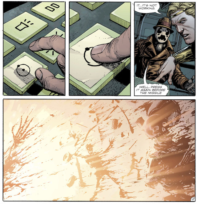 Sur le propos de Johns, je pense qu'il tente une déconstruction de Watchmen, comme Watchmen déconstruisait les super-héros, d'où les provocations envers l'oeuvre de Moore. Là où Watchmen consolidait le passage du super-héroïsme dans une nouvelle ère, Johns signifie peut-être qu'il est temps d'essayer de voir au-delà de Watchmen, sans le renier pour autant, mais ne plus en faire le référent.