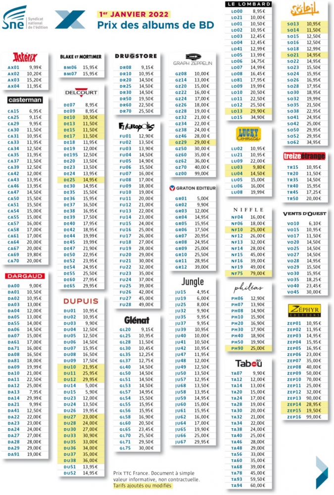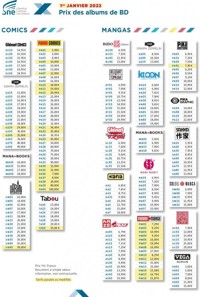 Pour celles et ceux qui avaient suivi nos articles des derniers mois, il n'y aura pas de grande surprise sur la grille dévoilée par le SNE - ces derniers mettant à jour ces grilles tarifaires deux fois par an. On peut faire le constat de l'augmentation des tarifs de Panini Comics tels que l'éditeur l'avait annoncé, quelques minces changement sont à noter du côté de Delcourt et ne concernent pas forcément la BD, et on voit aussi quelques lignes chez Graph Zeppelin, Tabou (dont on vous avoue qu'on ne relate pas vraiment l'actualité) et le tarif UB45 de Urban Comics correspond à celui des ouvrages publié dans le grand format "Urban".