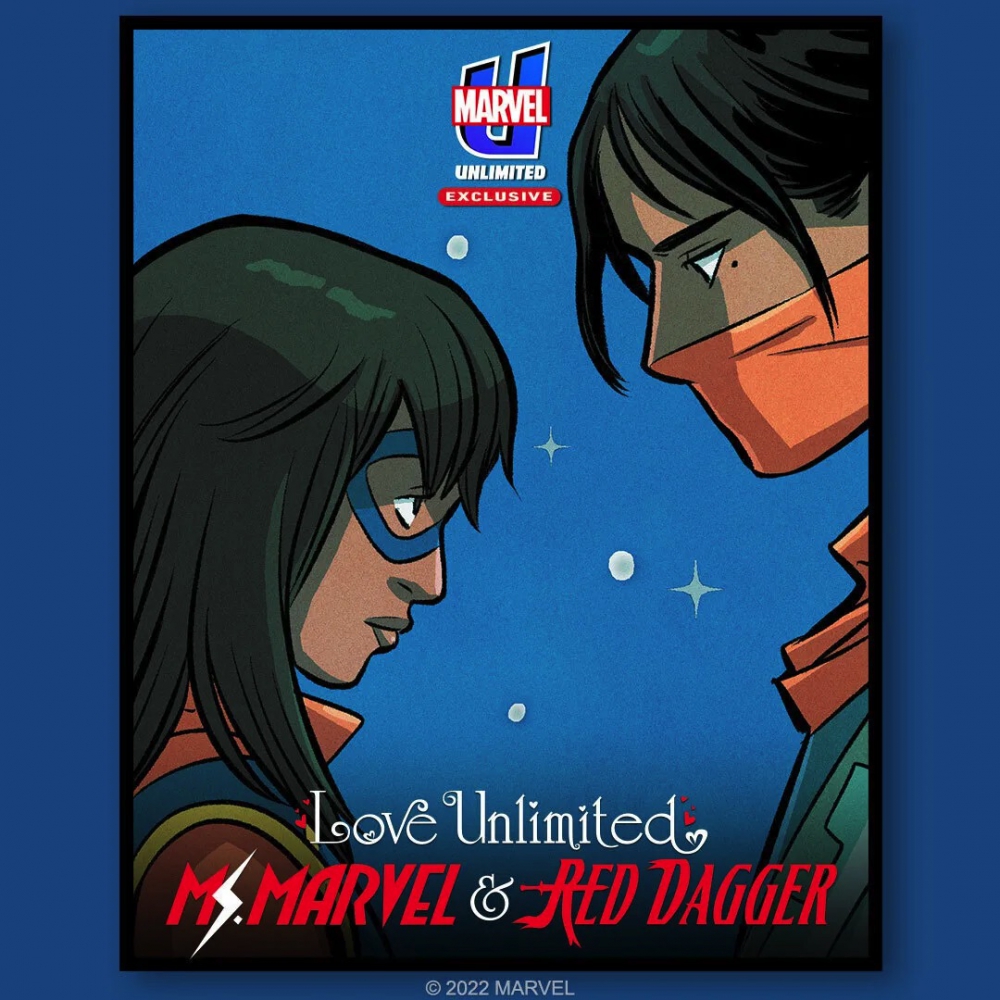 Ainsi, on peut retrouver sur Marvel Unlimited la publication Love Unlimited, une maxi-série qui qui proposera cinq histoires de romance autour des héros de l'univers de la Maison des Idées, à commencer par Ms Marvel (Kamala Khan) et Red Dagger - un choix un poil attendu alors que l'adaptation des comics sur Disney+ apporte un nouveau coup de projecteur sur l'héroïne. Cette histoire est écrite par Nadia Shammas avec Natacha Bustos aux dessins. Le récit s'intéresse à ces deux tourtereaux qui se sont embrassés sans pour autant se révéler leurs identités secrètes - avec la question de savoir si leur relation peut être entamée en partageant ce secret. Cette première histoire sera découpée en six chapitres.