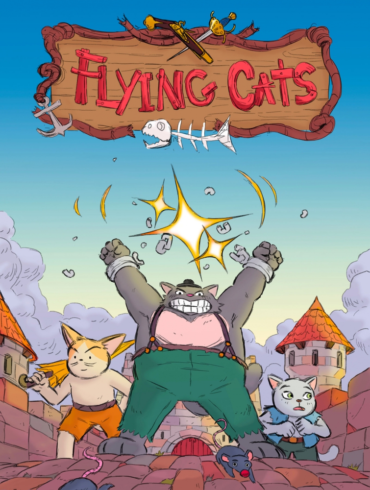 Sera donc publié en début d'année prochaine Flying Cats, une création originale qui nous vient de Thibaud Rémy et Eloi Amizet, qui ont tous deux travaillé sur le film d'animation Ernest & Célestine : le voyage en Charabie comme chara-designers - le film devant sortir dans nos salles de cinéma le 14 décembre prochain. L'album s'intéresse à deux chats magiques, Lewis et Goliath, qui se retrouvent échoués au royaume de sanguinaires rats-pirates après avoir fui une tempête pour retrouver leur maître d'apprentissage.
