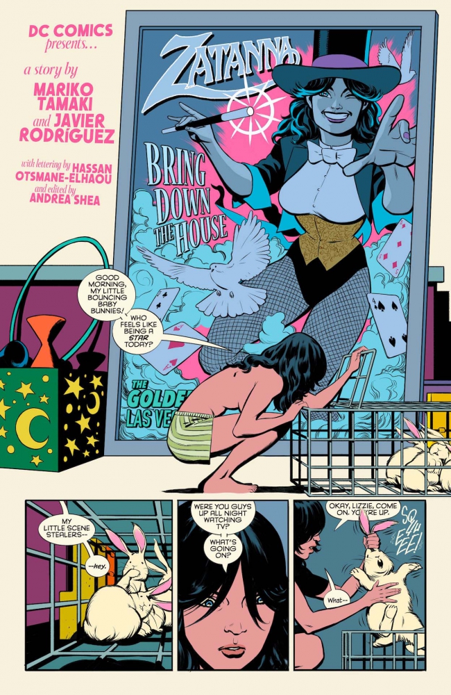 Zatanna : Bring Down the House est une proposition de deux personnalités déjà couronnées de succès chez DC ou ailleurs, avec d'une part Mariko Tamaki (qu'on avait pu lire sur Detective Comics, mais qui a surtout marqué avec son Supergirl : Being Super) au scénario, et de l'autre avec Javier Rodriguez (son Daredevil avec Mark Waid !) aux dessins. Le titre doit revenir en partie sur la jeunesse de la magicienne, et c'est notamment ce qui est littéralement illustré dans les premières pages de preview mises en ligne par DC Comics, la jeune Zatanna perdant patience face aux moqueries de certains gamins alors qu'elle tente de réaliser un tour de (vrai) magie.