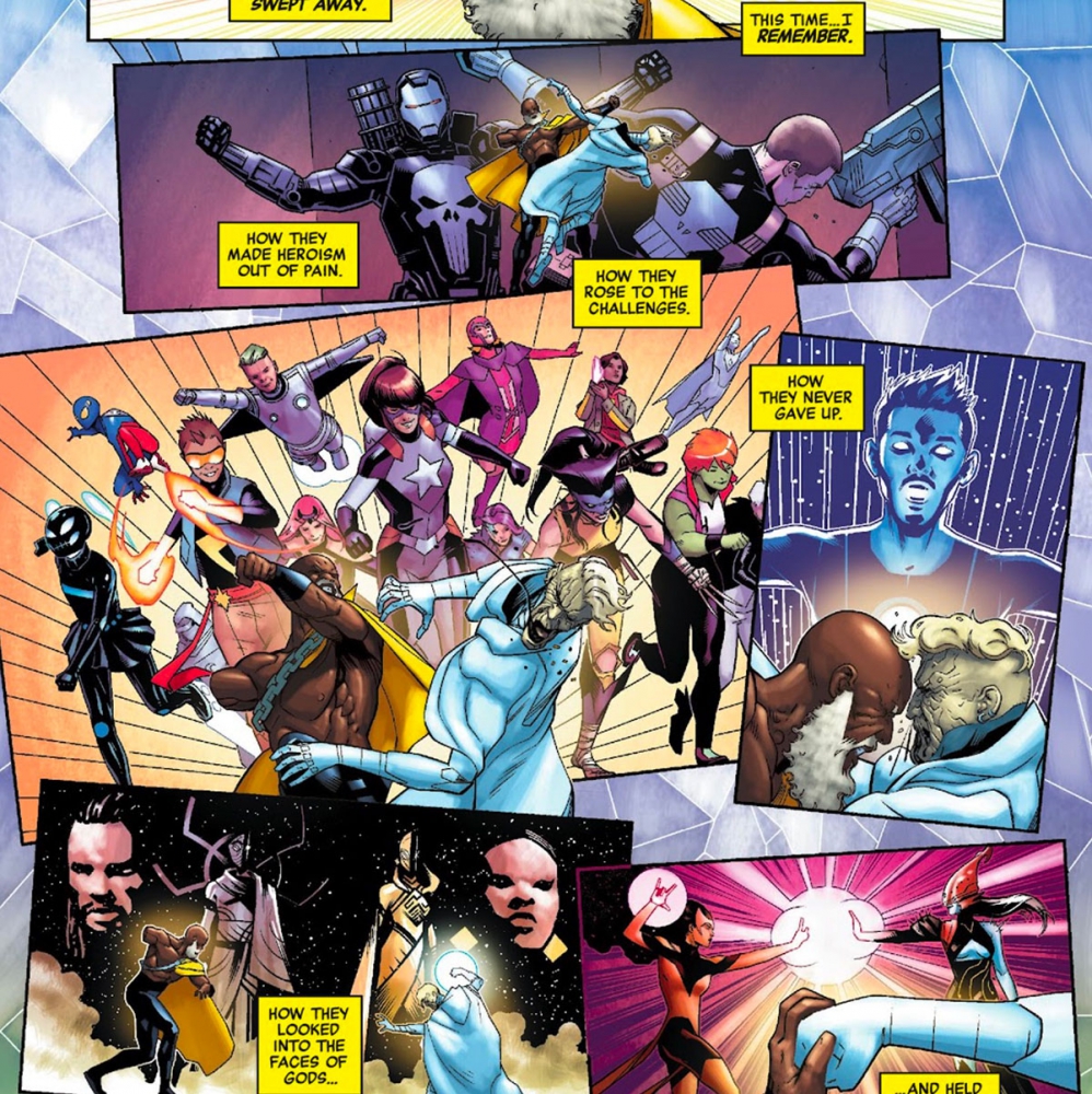 Pour celles et ceux qui auraient manqué le coche des Timeless #1 : le but est simplement de présenter une histoire qui à un moment ou un autre, intégrera des visions du futur de l'univers Marvel, ce afin de teaser ce que seront les prochains grands évènements pour l'année à suivre (soit 2025 en ce qui nous concerne aujourd'hui), et parfois même encore plus loin dans le futur. Si l'on regarde par exemple l'extrait de la planche ci-dessous, extrait du Timeless de l'an passé, on s'aperçoit que certains éléments teasés n'ont toujours pas été publiés. Comme le nouveau Punisher qui aurait fait face à une version War Machine de lui, ou la formation des fameux New Champions qui doit se dessiner pour l'année prochaine. De toute façon, les promesses (éditoriales) n'engagent que ceux qui y croient - et les font.