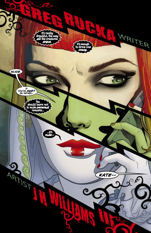 Le scénario ensuite. Celui-ci est plutôt basique mais efficace, et il suit les événements décrits dans 52 : la Religion du Crime a un nouveau leader, et Batwoman veut découvrir qui c’est et lui demander des comptes. Au passage elle croise le Chevalier Noir qui lui dit qu’il restera à l’écart tout un gardant un oeil sur elle. La première partie de l’histoire nous montre la Kate actuelle, le soldat qui travaille avec son père pour combattre le crime, qui est devenue Batwoman et ne laisse plus assez de place à Kate, celle qui rêve de vengeance et d’explications. Elle finira par rencontrer ce nouveau leader, qui s’avère être une femme, Alice, une folle qui se prend pour Alice Liddell (Alice au Pays des Merveilles) et pour qui personne n’a d’importance. Après une rencontre musclée, Alice parvient à s’échapper et commence alors la deuxième partie de l’histoire.